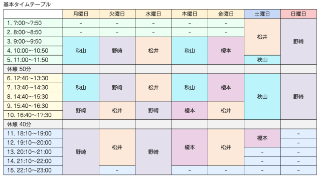 2025.12.29 基本タイムテーブル変更のお知らせ カテゴリー:お知らせ 2026年1月4日より変更させていただきます。 いつもスコアクリエイションをご愛顧いただきまして誠にありがとうございます。 基本タイムテーブル変更のお知らせです。 2026年1月4日より、以下リンク先のタイムテーブルに変更させていただきます。 基本タイムテーブル <新スタッフのご紹介> 榎本 裕明プロ 詳しいプロフィールは、以下リンク先のすこくりウェブ・スタッフ紹介ページをぜひご覧くださいませ! スタッフ紹介ページ ご理解のほど、どうぞよろしくお願いいたします。 < 前の記事 次の記事 >